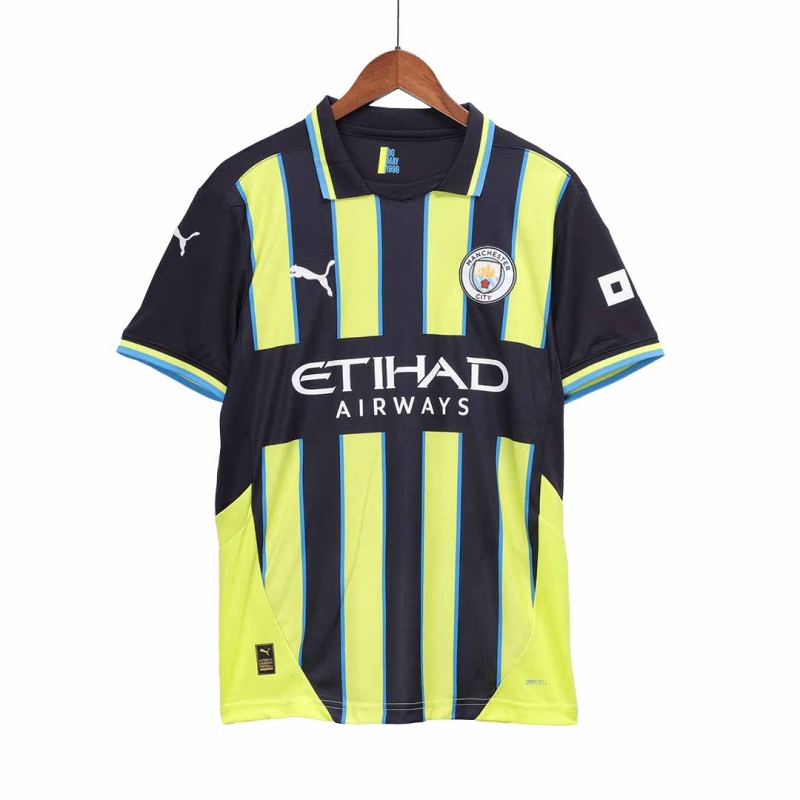 Manchester City Away Soccer Jersey 2024/25 Description about the Manchester City Away Soccer Jersey 2024/25:Let me introduce the Manchester City Jersey Away Soccer 2024/25, available for size S,M,L,XL,2XL,3XL,4XL. On May 30, 1999, Manchester City won the Second Division Play-Off against Gillingham thanks to a goal from Paul Dickov. To commemorate the exciting victory on May 30, 1999, the date is printed on the inside of the collar, making it clear that the Manchester City kit is monumental. The Manchester City Jersey is designed with a unique neon yellow and navy blue stripe. Vintage style collar is designed on the Manchester City Jersey. The classic paty of Manchester City kit is the iconic Manchester City FC badge on the chest, showing their pride and ambitions. Manchester City ambassador, stated this Manchester City jersey on this occasion: